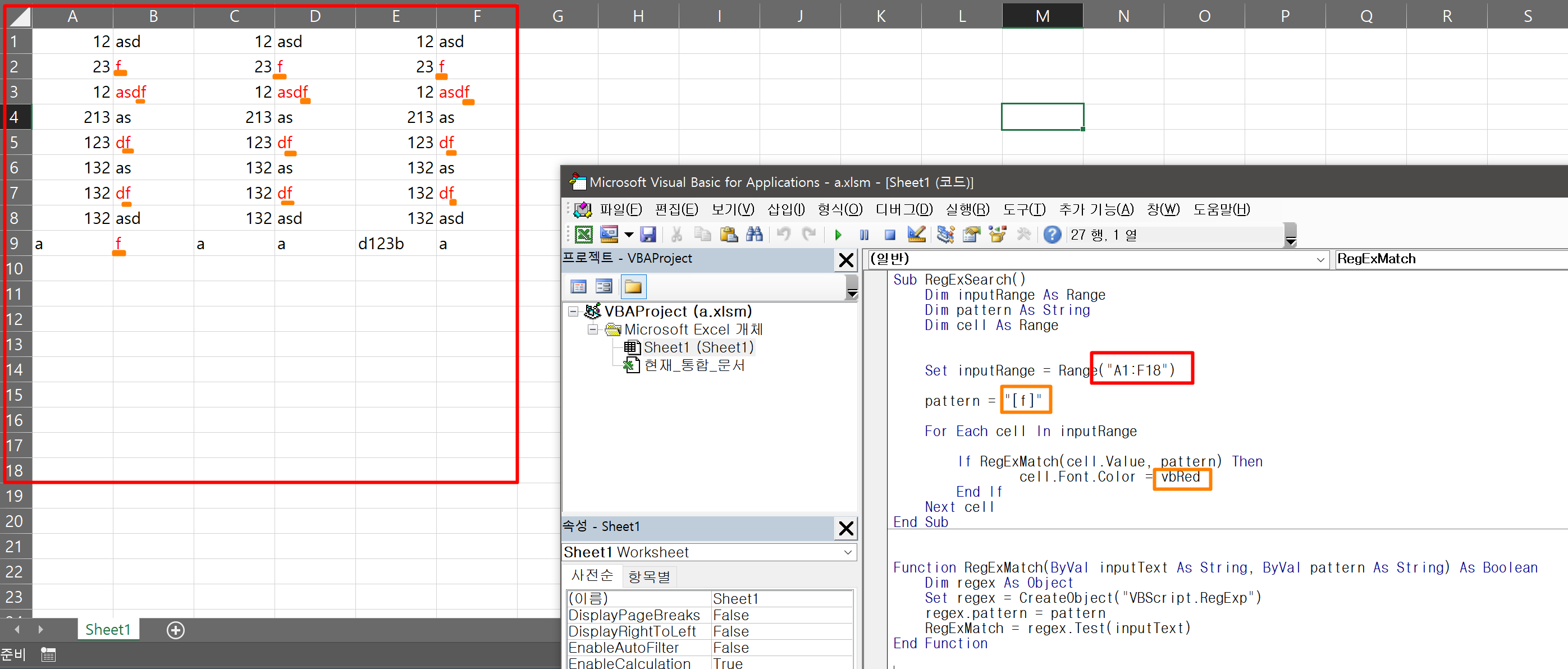 코드는 F5를 누르면 실행이 되는데, Range는 영역이고, pattern은 정규식 검색할 값을 넣으면 된다, 그리고 조건식에 true가 성립되면 vbRed로 폰트색을 빨간색으로 변경하게끔 만들어 두었다. 아래의 그림 참고.
